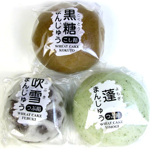 Kibun Manjyu - Fubuki/ Kokuto/ Yomogi - 3.17 oz.Ing: Fubuki - Sugar, water, red beans, wheat flour, wheat starch, yam flour, baking powder.(White and Black)Ing: Kokuto - Sugar, water, wheat flour, muscovado sugar, red bean, sugar, starch, baking powder, baking soda, caramel(For color), vegetable oil.(Brown)Ing: Yomogi - Sugar, wager, red beans, wheat flour, wheat starch, millet jelly, frozen mugwort, baking powder, vegetable oil.(Green)